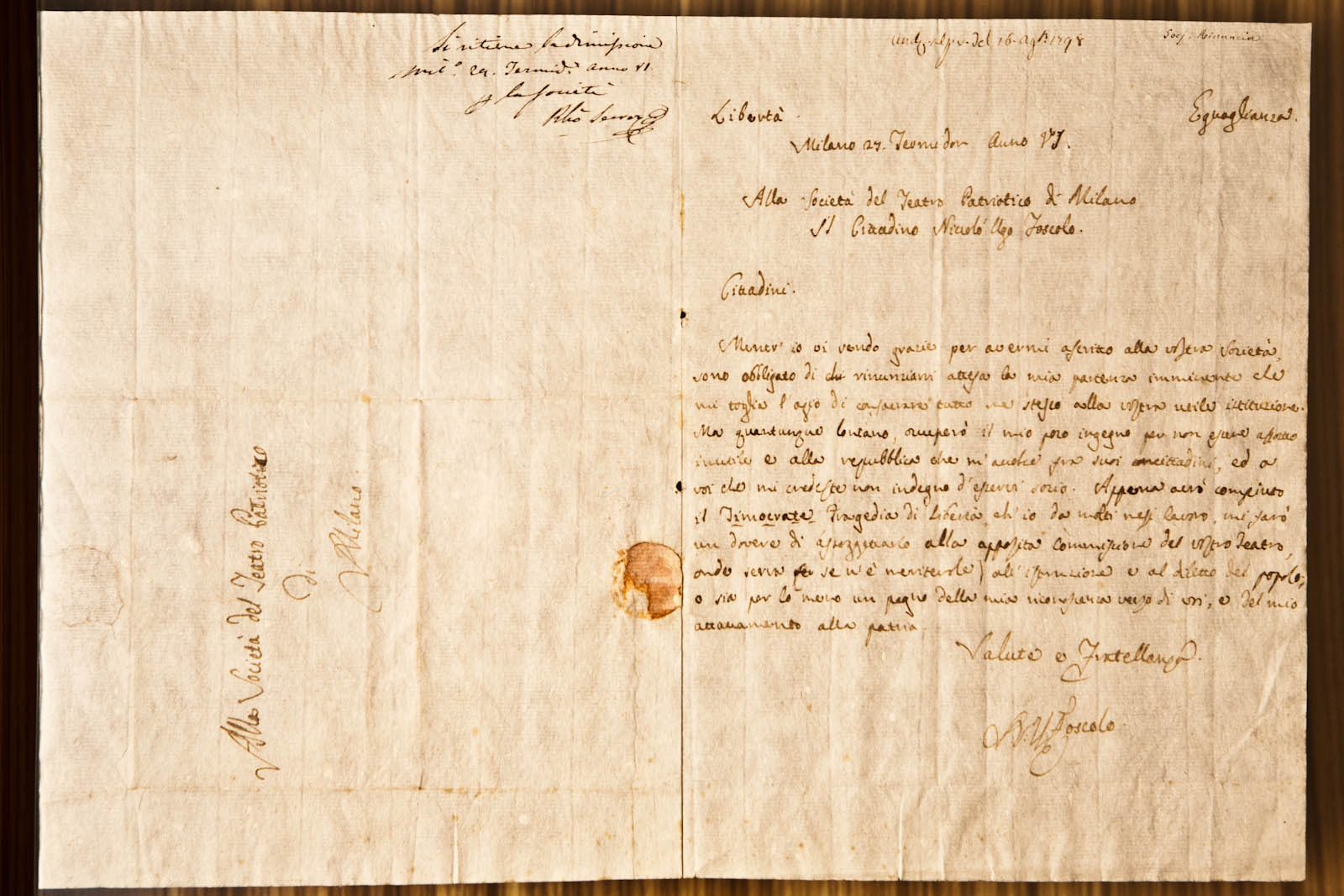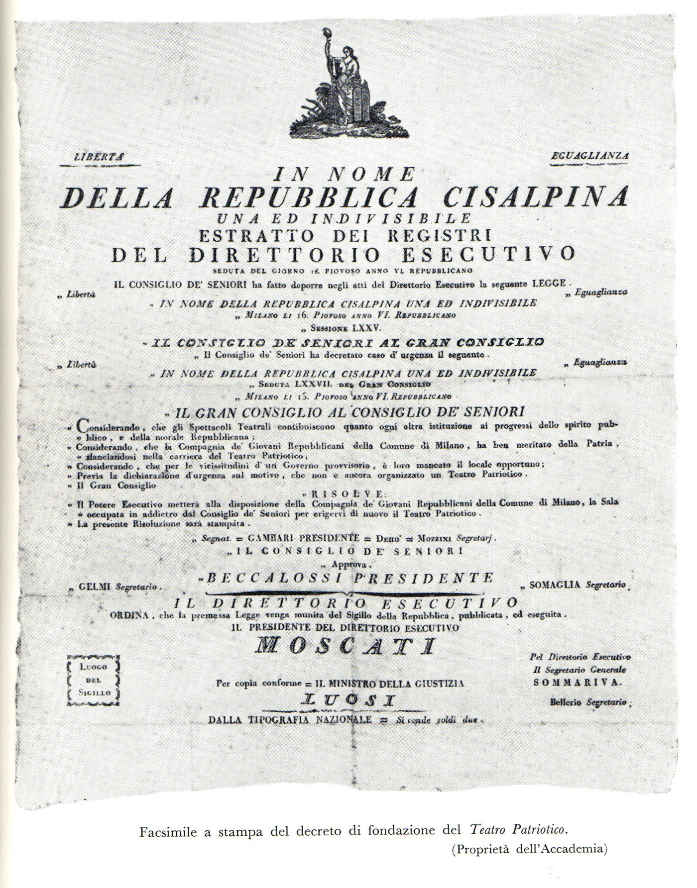 Il 7 luglio 1796 i cittadini Bernardoni e Giusti, rappresentanti di un gruppo di giovani nobili e borghesi che volevano diffondere gli ideali della rivoluzione francese attraverso il teatro, ricevono l’autorizzazione ufficiale dalla Repubblica Cisalpina alla loro attività di dilettanti drammatici e chiedono uno spazio adeguato dove allestire sistematicamente rappresentazioni per un pubblico numeroso. Chiedono inoltre di fondare una scuola, gratuita, aperta a ragazzi e ragazze: nasce a Milano, nel teatrino del Collegio dei Nobili, quella che allora si chiamava “scuola di declamazione”.